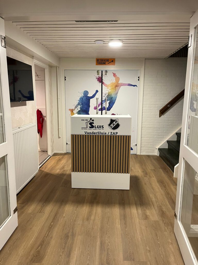 We hopen dat de doorstroom hiermee vlot verloopt. Maar mocht u onverhoopt toch even langer moeten wachten, is dat in deze mooie entree ook zeker geen straf. Op het scherm dat in de entree hangt kunt u dan alvast de wedstrijdinformatie bekijken, wie de balsponsoren zijn en natuurlijk de speelsters van de week! En vergeet u vooral ook niet even naar rechts te kijken, daar hangt nu onze prijzenkast 2.0.